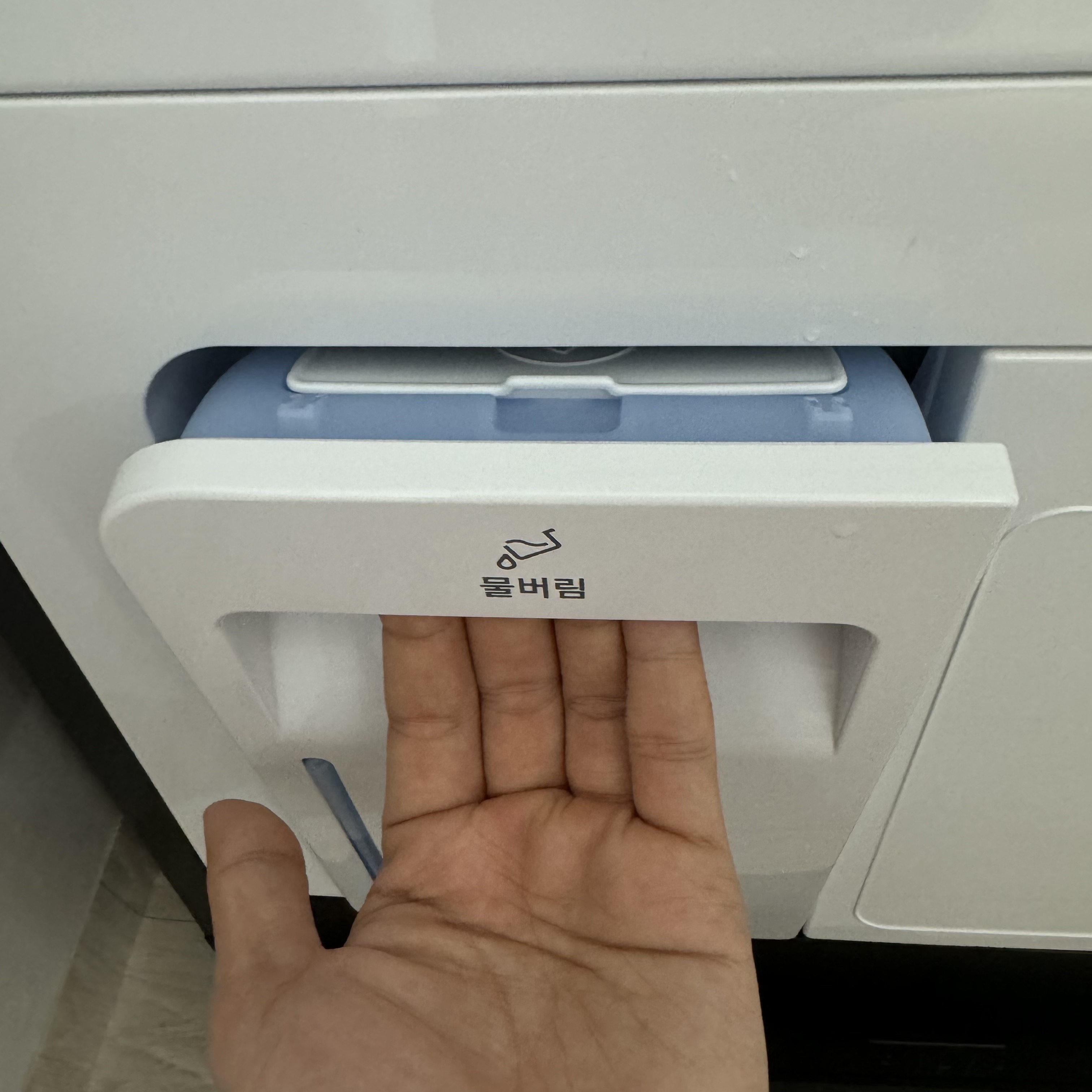 그 다음에 이제 스타일러 하단 부를 보시면, 물버림과 물보충 그리고 가운데 버튼이 하나 있습니다.