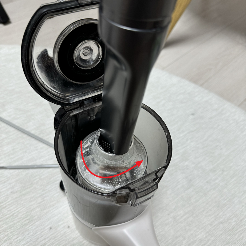 그 다음 큰 먼지 분리 필터를 빼내야하는데, 청소기에 있는 틈새 흡입구를 꽂아서 반시계 방향으로 돌려주면 쉽게 뺄 수 있습니다.